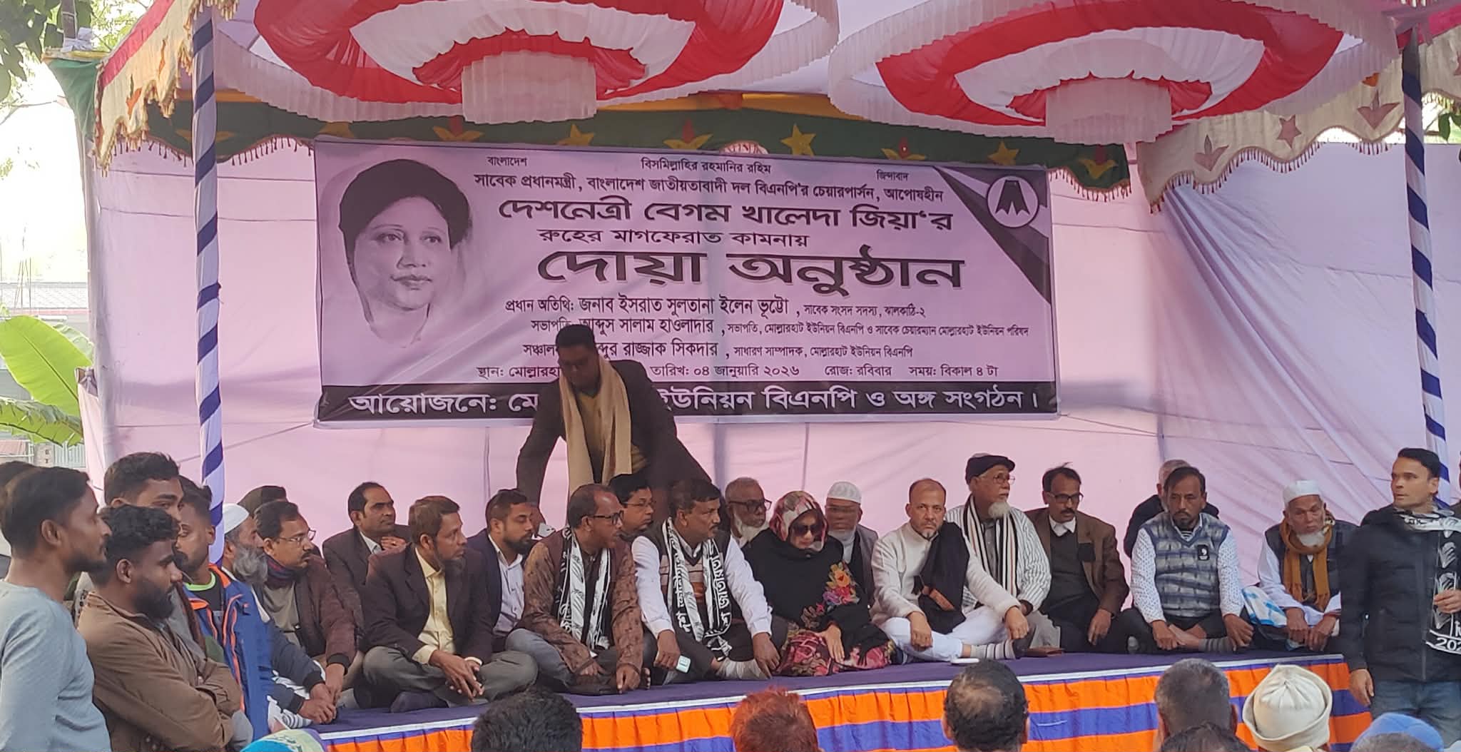 (৪ জানুয়ারি) রোজ রবিবার বিকাল ৪ ঘটিকায় মোল্লারহাট চৌমাথায় দোয়া অনুষ্ঠিত হয়।
