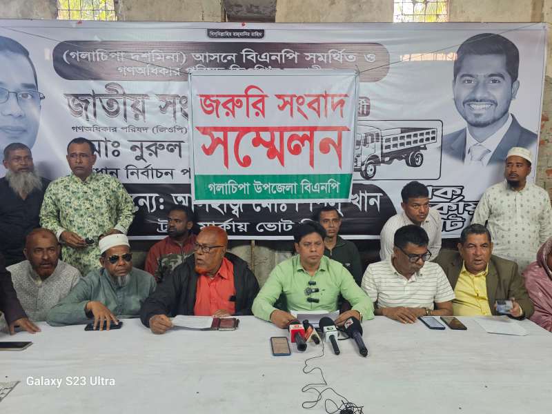 পটুয়াখালীর গলাচিপা উপজেলা বিএনপির নবগঠিত সদস্য সচিব আলতাফ খান সংবাদ সম্মেলন বলেন, আপনারা জানেন গত ১২ ফেব্রুয়ারি নির্বাচনে গলাচিপা দশমিনা সমন্বয়ে পটুয়াখালী ৩ আসনে বাংলাদেশ জাতীয়তাবাদী দল বিএনপি সমর্থিত এবং বাংলাদেশ জাতীয়তাবাদী দল বিএনপি'র সম্মানিত চেয়ারম্যান জনাব তারেক রহমানের নির্দেশে গণধিকার পরিষদের চেয়ারম্যান জনাব নুরুল হক নুরু ভাইকে আমরা বিপুল ভোটের ব্যবধানে জয়লাভ করাতে সক্ষম হই। এজন্য গলাচিপা উপজেলা বিএনপি'র নবগঠিত কমিটির পক্ষ থেকে গলাচিপা বাসিকে ধন্যবাদ জানাই। প্রিয় সাংবাদিক ভাই ও বোনেরা আপনারা ইতিমধ্যে লক্ষ্য করেছেন যে উক্ত নির্বাচনে ঘোড়া মার্কার পরাজিত প্রার্থী বিএনপি থেকে বহিষ্কৃত জনাব হাসান মামুন ও তার সাথে থাকা আওয়ামী লীগের সন্ত্রাসীরা মিলে গ্রামগঞ্জের ট্রাক মার্কার সমর্থক ও নিরীহ বিএনপি নেতাকর্মীদের উপর হামলা চালিয়ে গণধিকার পরিষদের নামে মিথ্যা প্রোপাগান্ডা চালিয়ে যাচ্ছে।