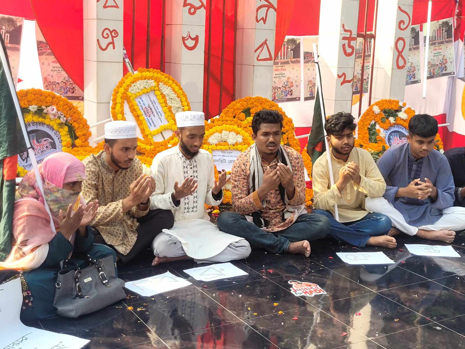এসময় তারা হাতে হাদি হত্যার বিচার চেয়ে ও বাংলা সংস্কৃতি ও ভাষার বিকৃতি বন্ধে বিভিন্ন লেখা সম্বলিত প্ল্যাকার্ড ও ভাষা শহীদদের প্রতি শ্রদ্ধা নিবেদনে কেন্দ্রীয় শহিদ মিনারে যান।শহিদ মিনারে পৌছে তারা ভাষা শহীদদের স্মরনে তাদের আত্মার মাগফিরাত কামনায় মিলাদ ও দোয়া মোনাজাত করেন।