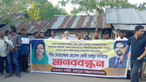 ঝালকাঠীর নলছিটিতে পীর মোয়াজ্জেম হোসেন ফেরি চালুর দাবিতে মানববন্ধন
