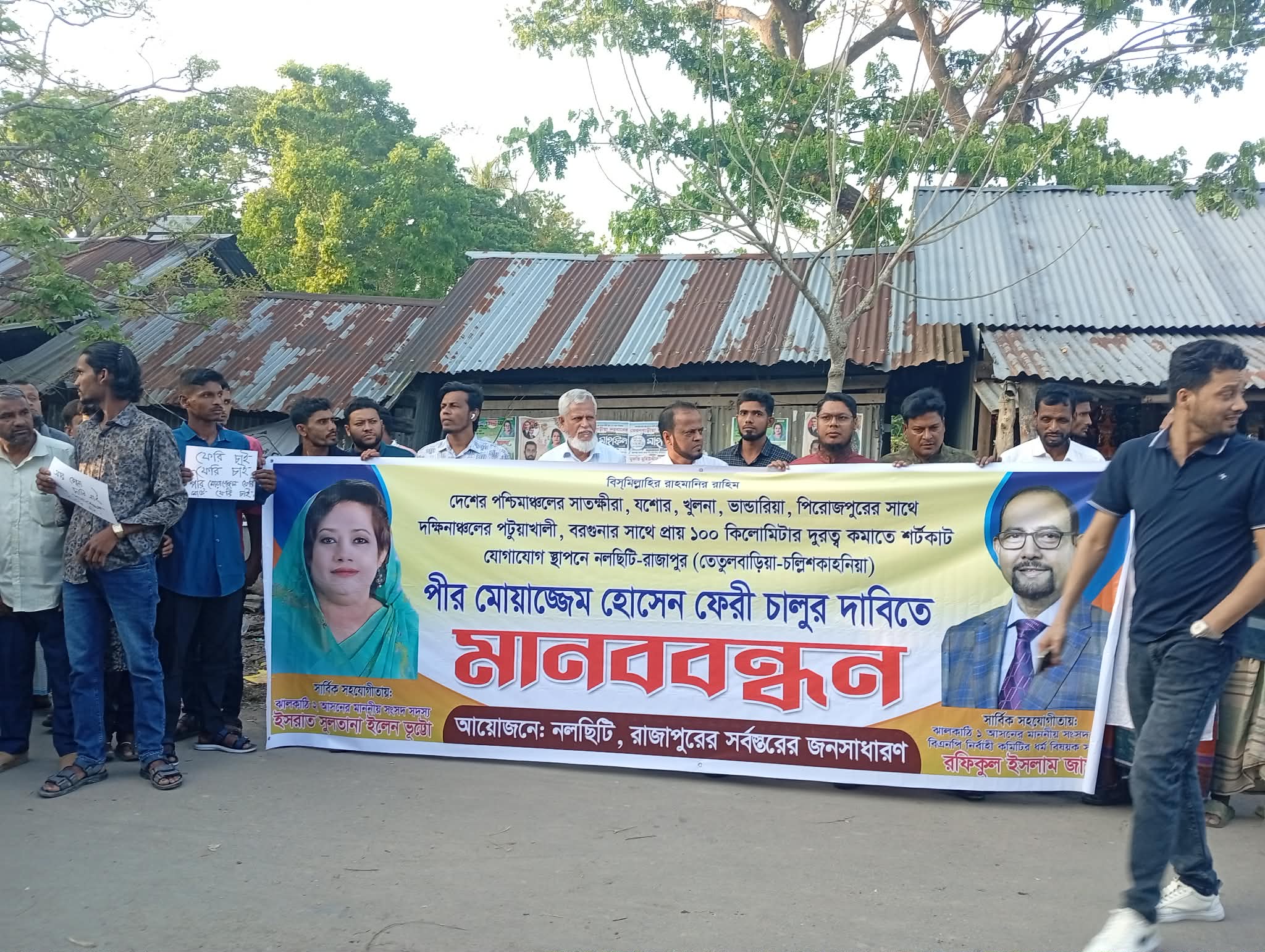 নলছিটিতে পীর মোয়াজ্জেম হোসেন ফেরি চালুর দাবিতে মানববন্ধন