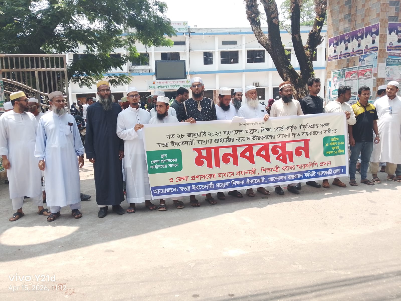 ঝালকাঠিতে ইবতেদায়ী মাদ্রাসা শিক্ষকদের মানববন্ধন ও স্মারকলিপি প্রদান