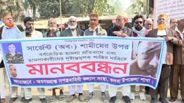 কসবায় বাদশা জুয়েলসহ ৫জনের বিরুদ্ধে থানায় মামলা,! অবসরপ্রাপ্ত সার্জেন্ট শামীমের ওপর হামলার প্রতিবাদে মানববন্ধন। মো জুয়েল রানা কসবা প্রতিনিধি:-ব্রাহ্মণবাড়িয়ার কসবায় মাদক ব্যবসায় বাধা দেওয়ার ফলে ঘরবাড়ি ভাংচুর