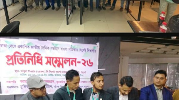 দৈনিক বর্তমান বাংলা’র সিলেট বিভাগীয় প্রতিনিধি সম্মেলন ও পরিচয়পত্র বিতরণ! নিজস্ব প্রতিবেদক: সত্যনিষ্ঠ ও দায়িত্বশীল সাংবাদিকতার মাধ্যমে গণমাধ্যমকে জনআস্থার জায়গায় নিয়ে যেতে মাঠপর্যায়ের প্রতিনিধিদের আরও সক্রিয় ভূমিকা পালনের আহ্বান